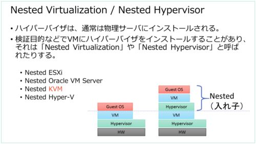 ESXi など VM に Nutanix CE をインストールすと、Acropolis Hypervisor が KVM なので、いわゆる Nested KVM になります。 いまさらですが、Nuanix Meetup#7 の話の一部を・・・ Nested Virutalization ハイパーバイザは、通常は物理サーバにインストールさ…