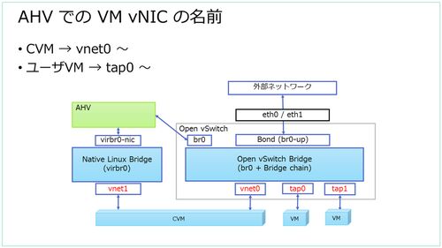 AHV で起動する VM には、CVM とユーザ VM(UVM)がありますが、vNIC のデバイス名が異なります。 CVM → vnet0 ~ vnet2 UVM → tap0 ~
