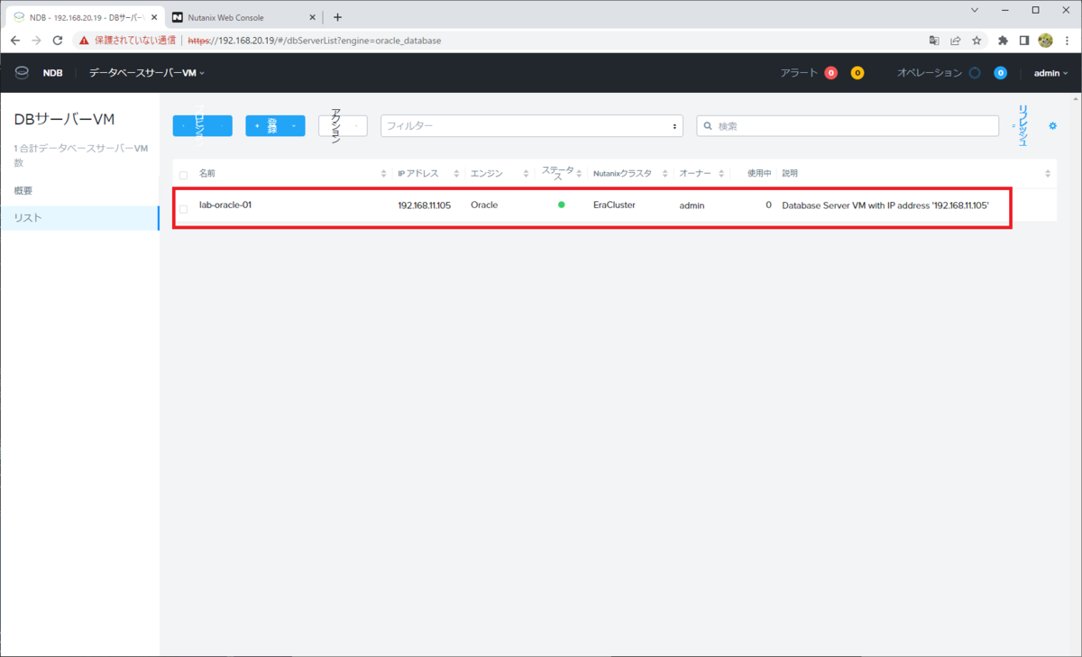 「データベース サーバー VM」画面に、DB サーバが登録されました。
