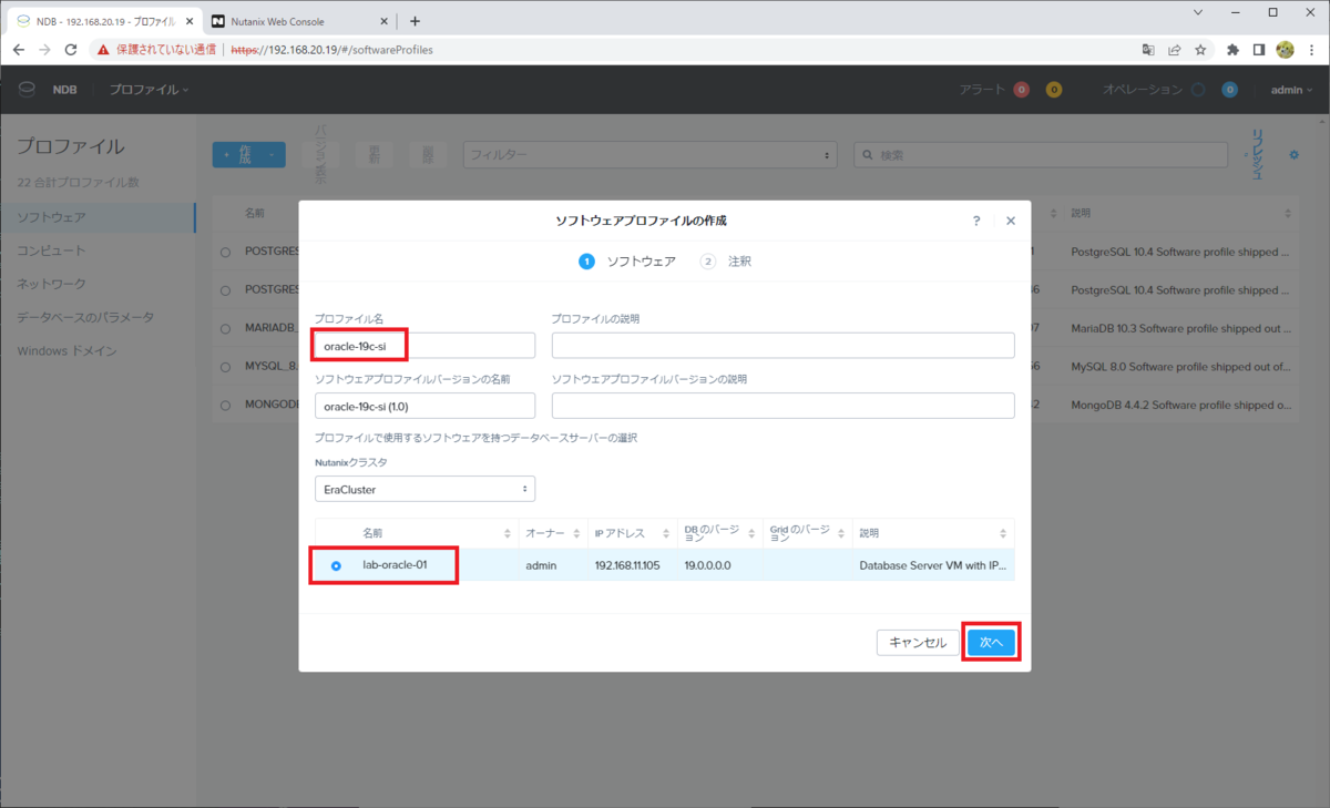 プロファイル名を入力して、NDB に登録してある DB サーバの仮想マシンを選択して「次へ」をクリックします。