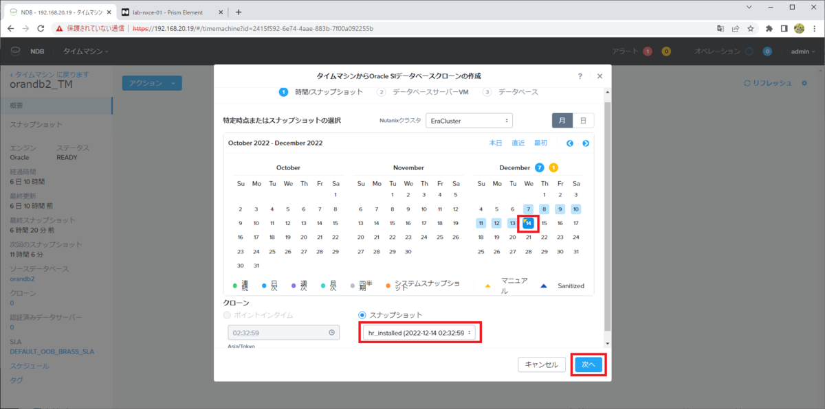 スナップショットを作成した日(12月14日)と、スナップショットを選択して「次へ」をクリックします。