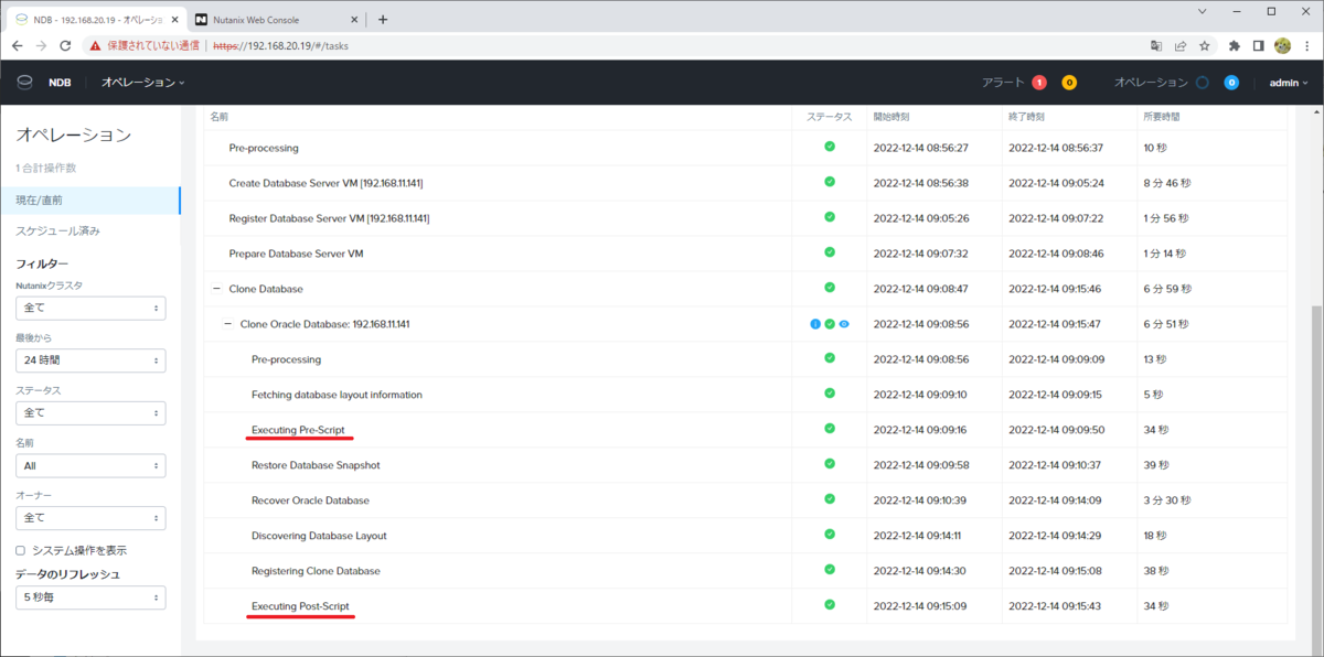 クローンが開始されるので、「オペレーション」画面でステータスを確認しつつ完了を待ちます。「Clone Database」のステータスを開いてみます。