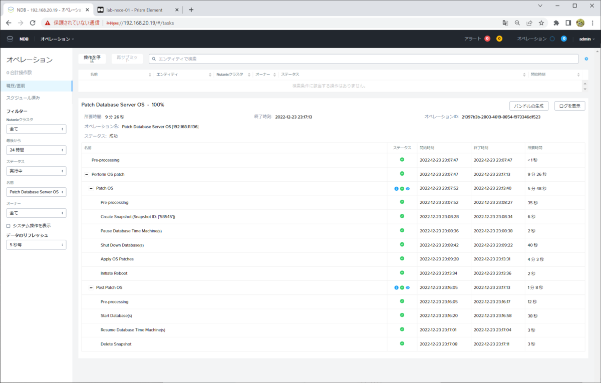 NDB の Web UI から、DB サーバに OS パッチを適用します。今回はメンテンナンス ウィンドウは利用せず、手動でパッチ適用を開始します。
