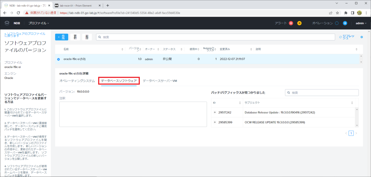 NDB では、「oracle-19c-si」という名前でソフトウェア プロファイルを作成してあります。