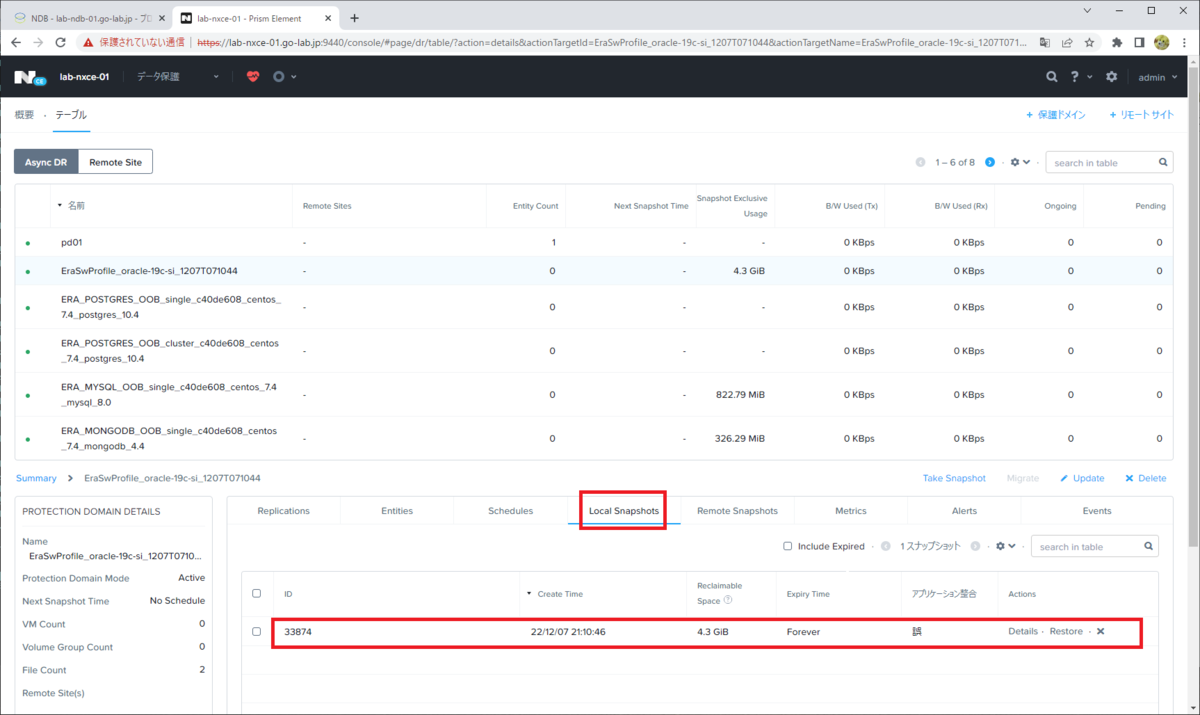 Prism Element の「データ保護」→「テーブル」→「Async DR」を開くと、「EraSwProfile_oracle-19c-si_1207T071044」といった保護ドメインが作成されています。これは「EraSwProfile_<プロファイル名>_<タイムスタンプ>」といった命名規則になっています。