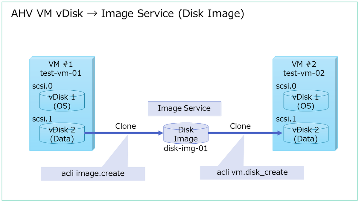 仮想マシンに、acli vm.disk_create でイメージ サービスから vDisk を作成できます。この処理も、実際には vDisk のクローンが実行されます。