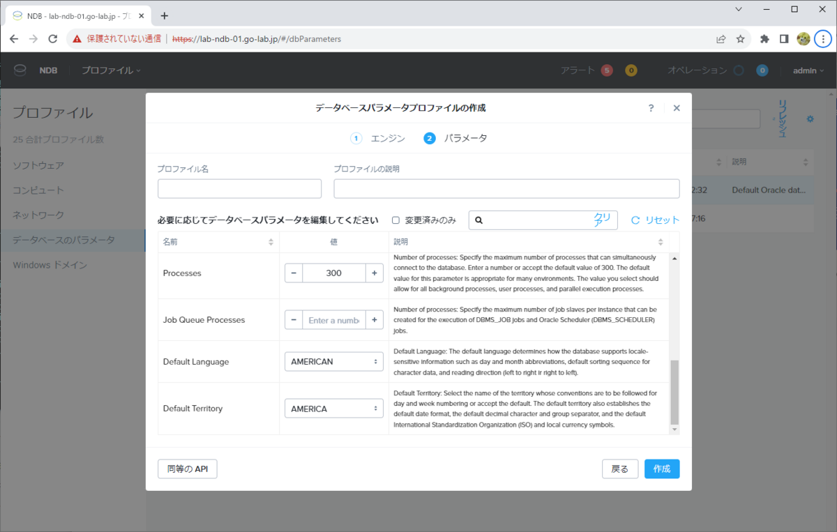 NDB Server UI でのデータベース パラメータ プロファイル作成画面では、入力フォームが用意されていないパラメータが追加できません。そこで、REST API でパラメータを追加してみます。今回は、設定されたことがわかりやすい max_idle_time を追加してみます。