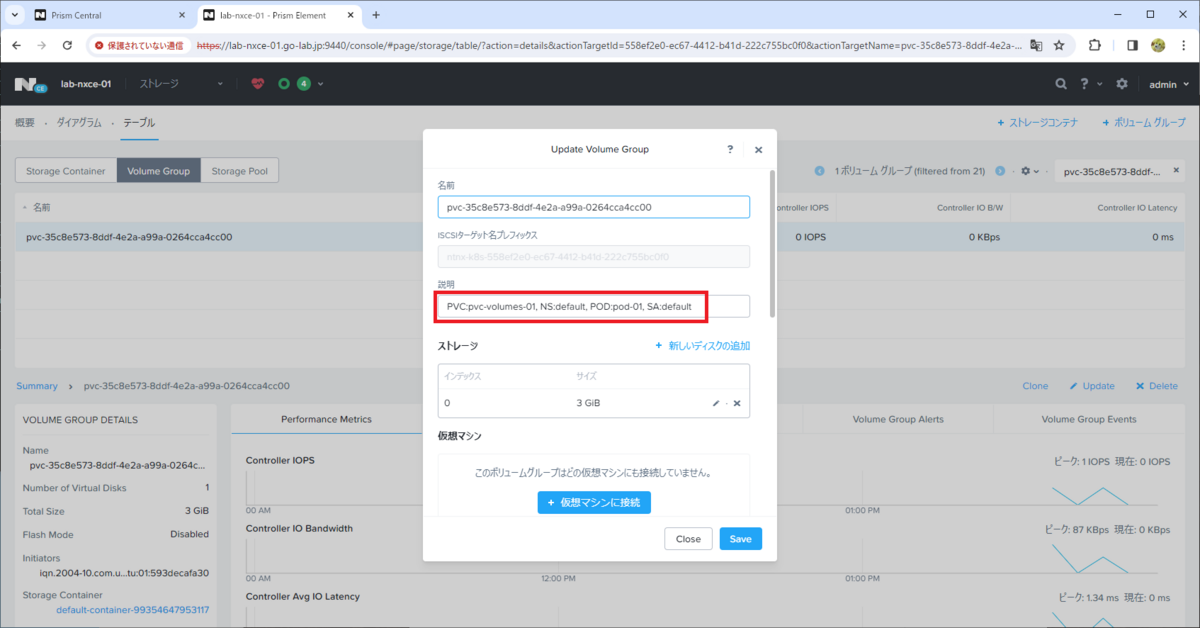 Prism Elemnt の「ストレージ」→「テーブル」→「Volume Group」を開くと、PV(pvc-35c8e573-8ddf-4e2a-a99a-0264cca4cc00)と同名の Nutanix Volumes VG が作成されていることがわかります。VG の「Update」画面を開くと、「説明」欄に関連する Kubernetes リソース オブジェクトが記述されています。