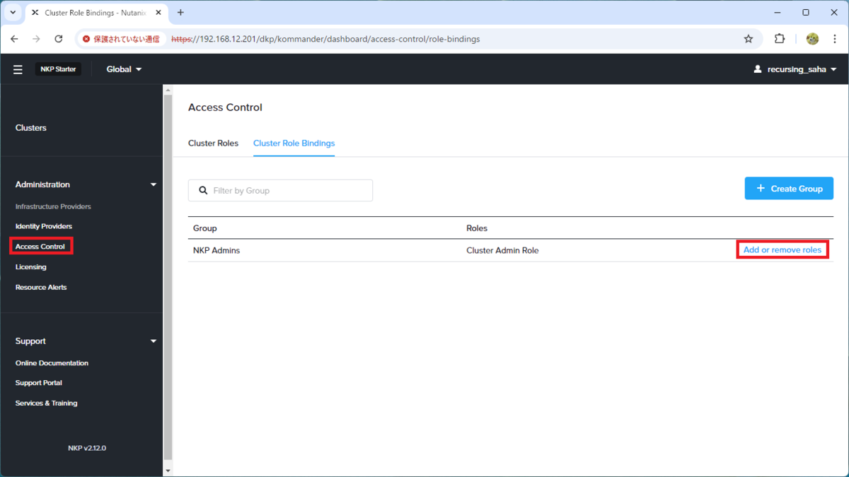 そして、グループ(ここでは NKP Admins)の「Add or remove roles」をクリックします。