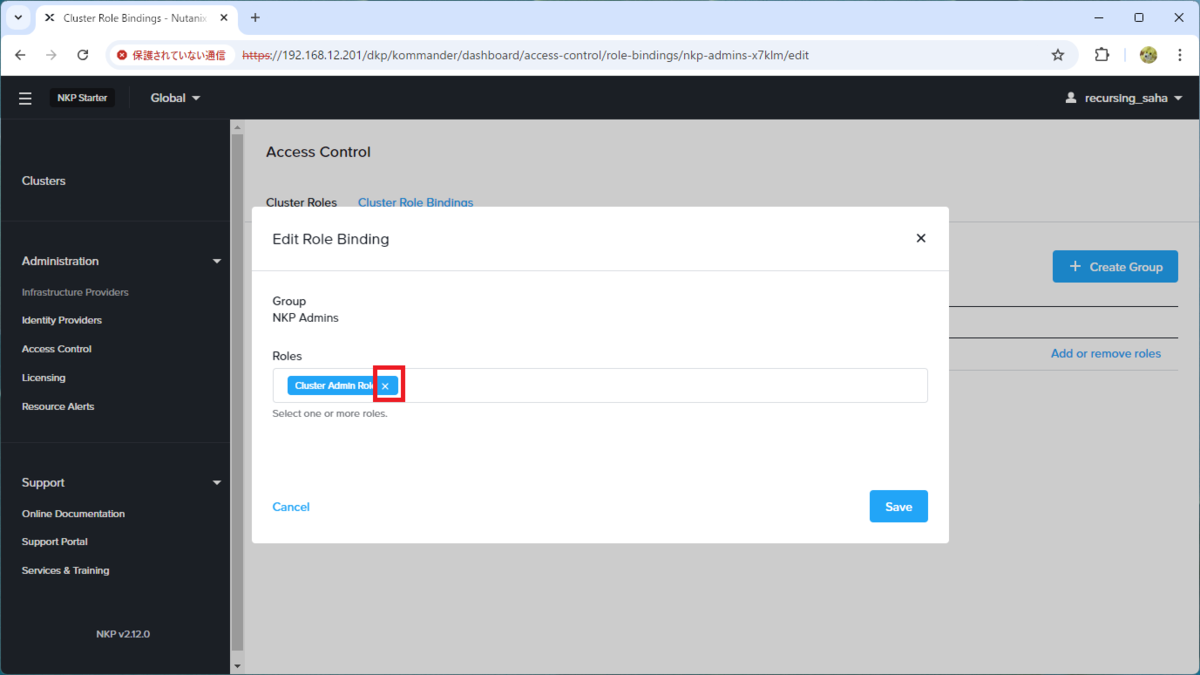 まず、NKP グループへのロール割り当て(Cluster Role Bindings)を削除します。ちなみに、先に NKP グループを削除しようとするとエラーになってしまいます。