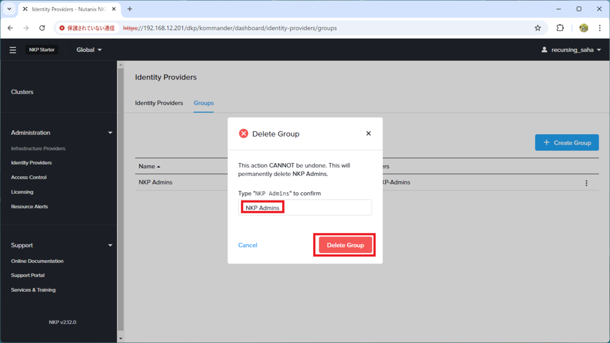 グループ(ここでは NKP Admins)の行末にあるボタンから、「Delete」をクリックします。