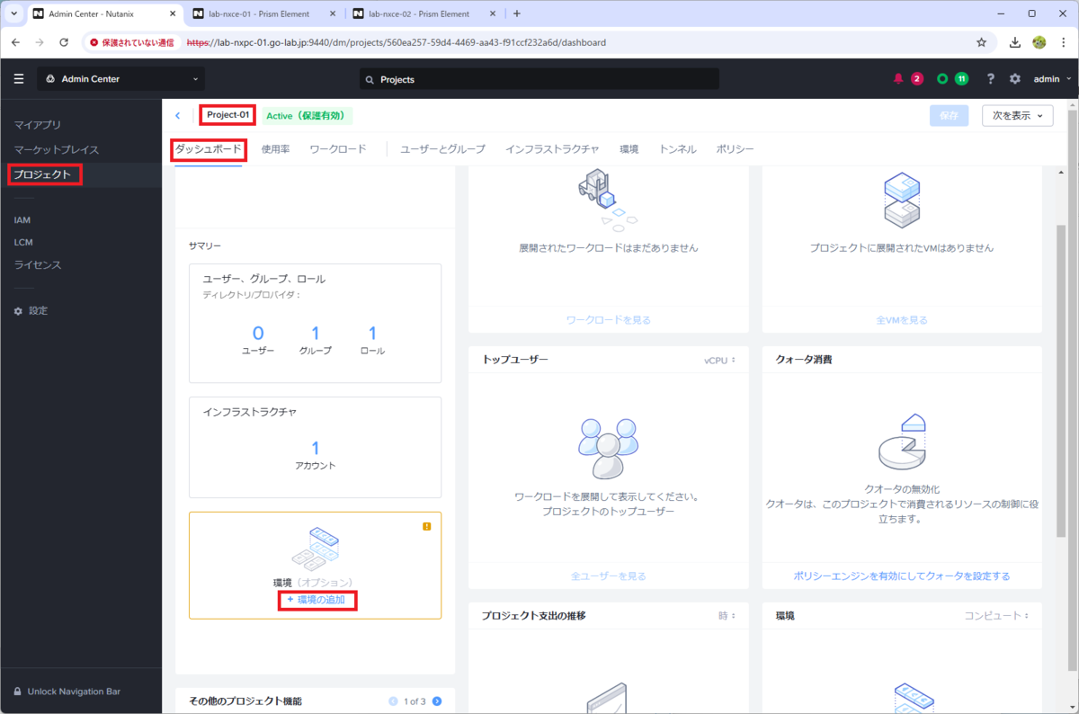 Prism Central の「Admin Center」→「プロジェクト」→ 作成したプロジェクト(Project-01)のダッシュボードを開くと、環境が未登録のため、警告状態(黄色)になっています。
