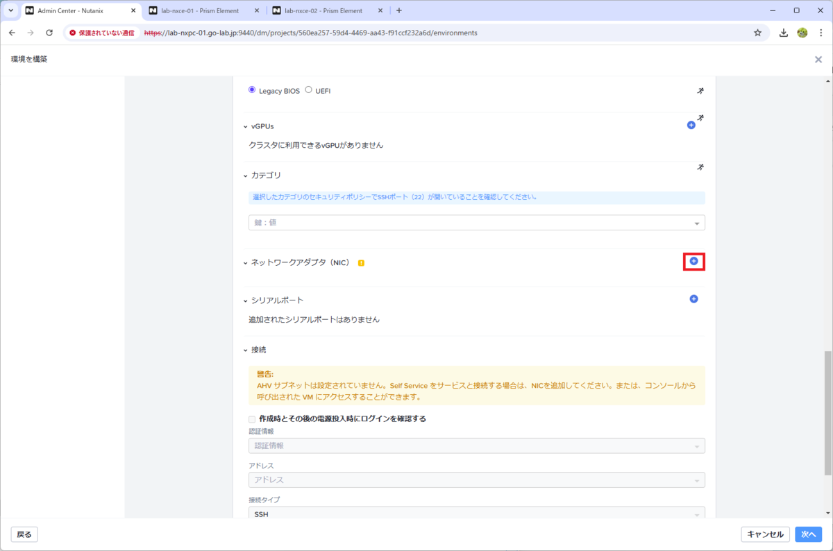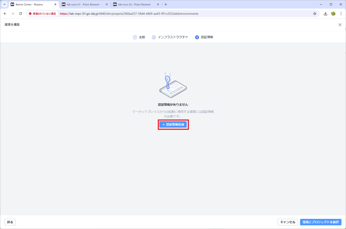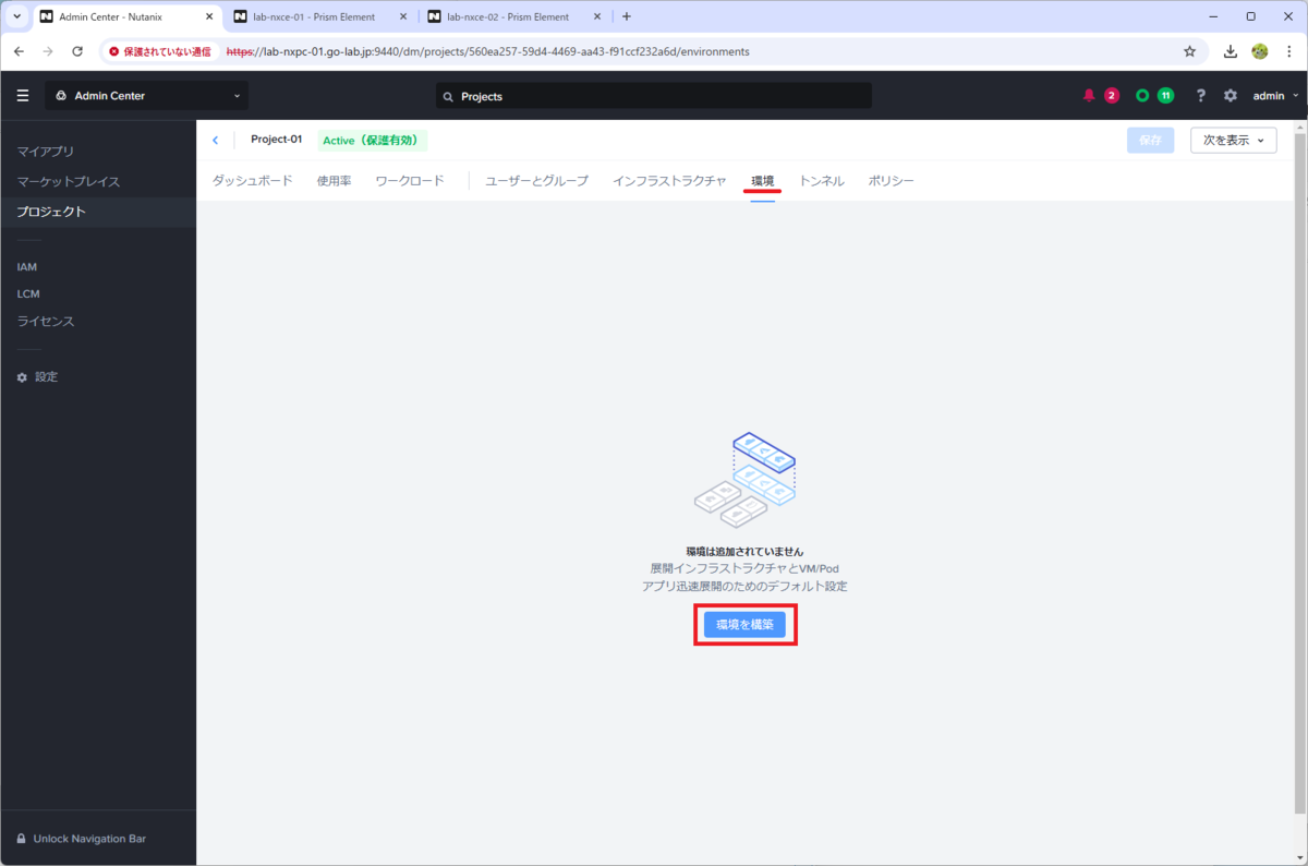 Prism Central で作成したプロジェクトを利用可能な状態にするため、「環境」の設定を追加します。