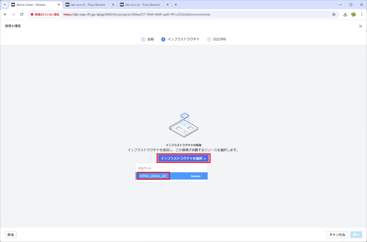 「インフラストラクチャの選択」をクリックして、前回の投稿 で登録したインフラストラクチャのアカウントを選択します。