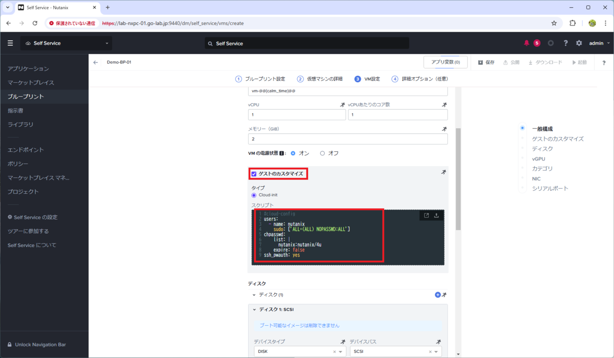 Prism Central で「Self Service」→「ブループリント」を開き、「ブループリントの作成」→「単一の仮想マシンのブループリント」を開きます。