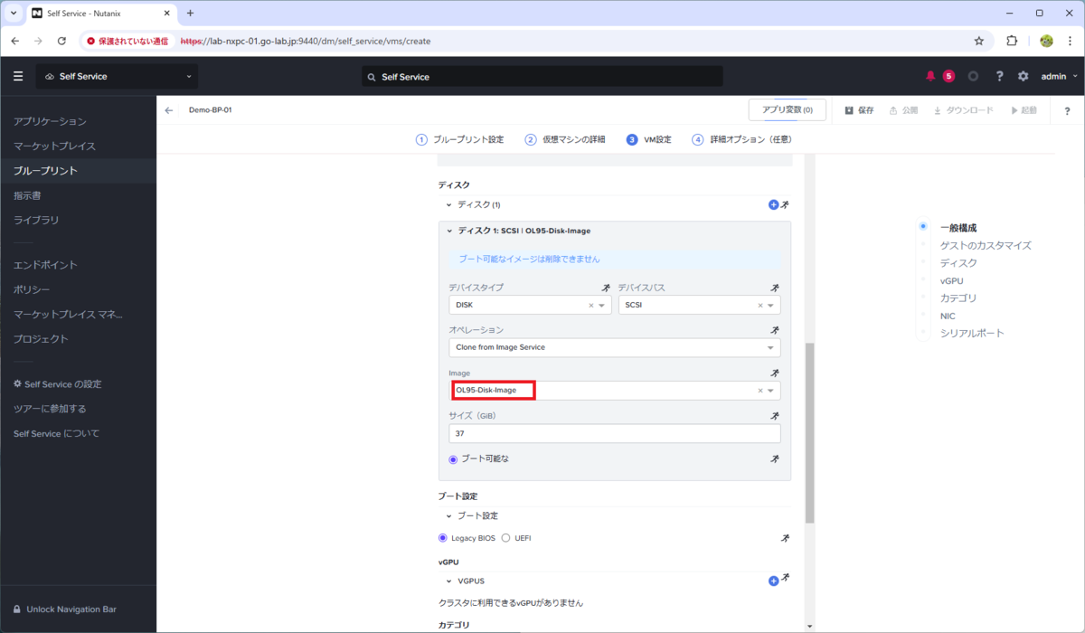 ブループリントで展開する仮想マシンのクローン元として、Prism Central のイメージ サービスに、Oracle Linux 9.5 Cloud Image の qcow2 ディスクをアップロードしてあります。