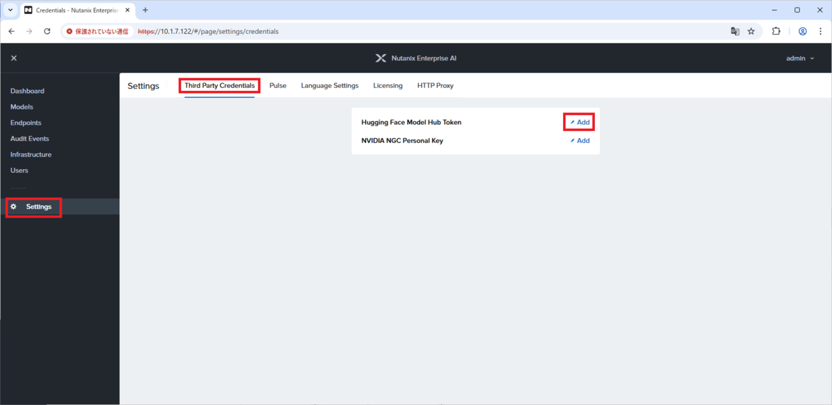 NAI-UI の「Settings」→ Third Party Credentials」タブで、「Add」をクリックします。