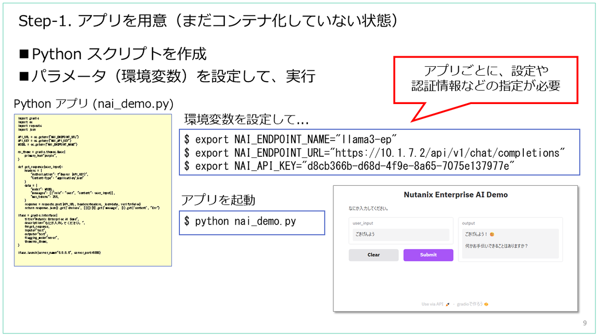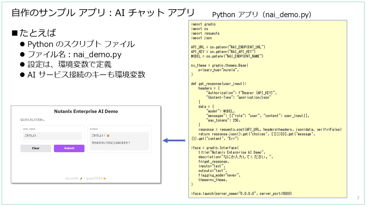 これは Nutanix Enterprise AI(NAI)による推論エンドポイントに接続していますが、ただの自作アプリです。