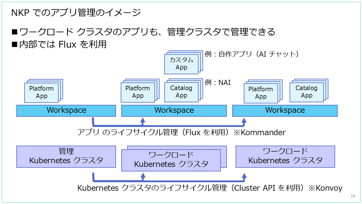 NKP でのアプリ管理機能では、ワークロード クラスタのアプリも管理クラスタで管理できます。この機能は、内部では Flux が利用されています。
