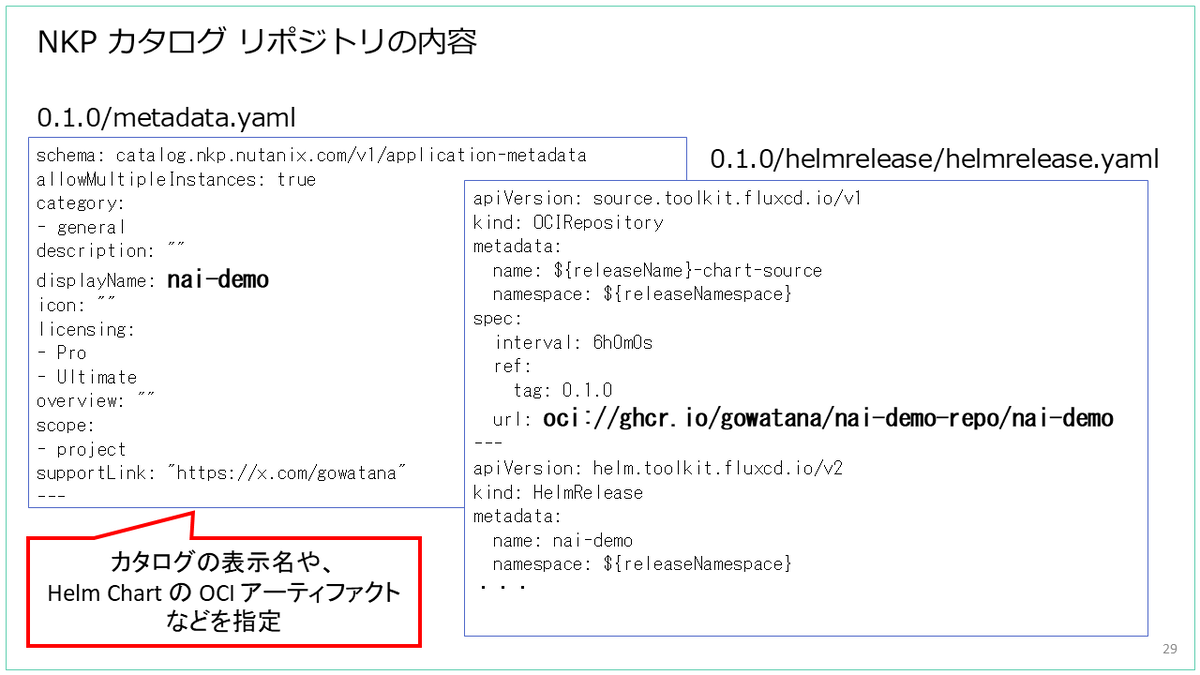 NKP のカタログ リポジトリに含まれるファイルでは、NKP カタログに表示するアプリの名前や、Helm Chart の URL(oci://~)などを記載します。