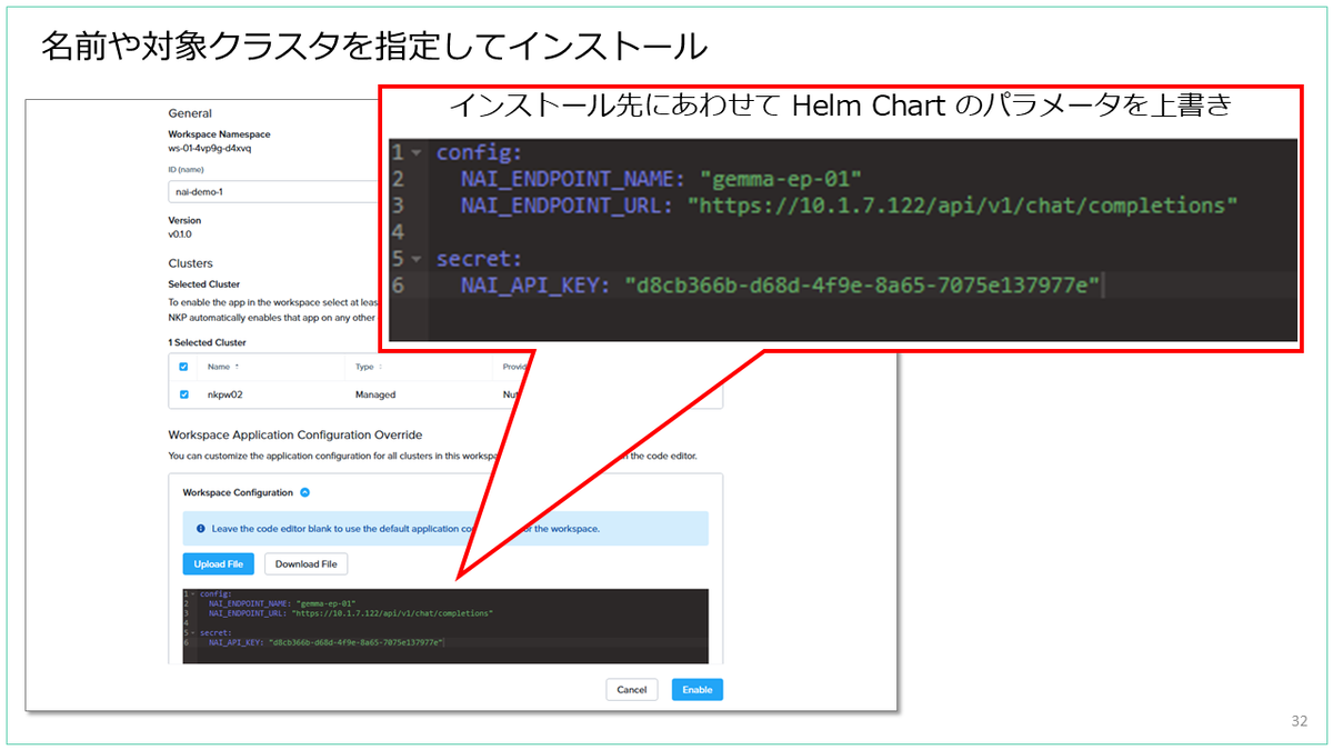 NKP カタログに登録されたアプリ(この例では nai-demo)は、パネル右下のボタン →「Enable」をクリックすると、インストール画面が表示されます。